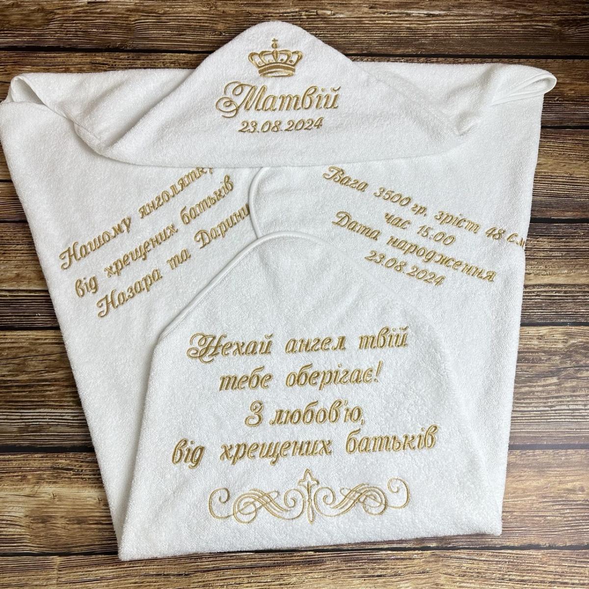 Ніжна та вишукана хрестильна крижма розміром 100×100 см — ідеальний вибір для особливого дня вашого малюка. Виготовлена з м’якого махрового полотна, вона має капюшончик із вишивкою, що додає зворушливості й практичності. Тканина дуже приємна на дотик, не подразнює ніжну шкіру дитини, чудово вбирає вологу та забезпечує комфорт після купелі. Висока якість матеріалу і вишивки гарантує, що крижма залишиться пам’ятною річчю на довгі роки.
