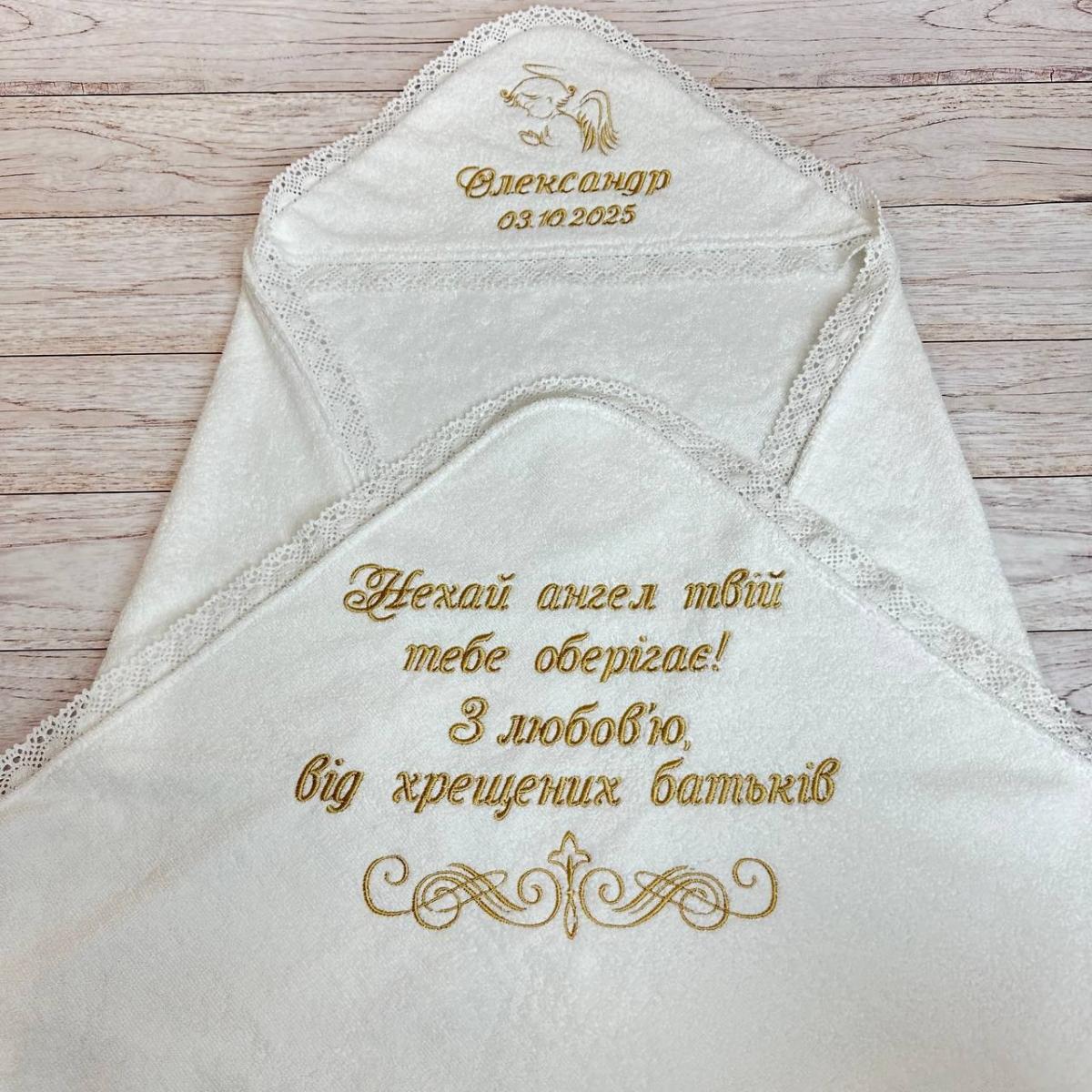 Ніжна та вишукана хрестильна крижма розміром 100×100 см — ідеальний вибір для особливого дня вашого малюка. Виготовлена з м’якого махрового полотна, вона має капюшончик із вишивкою, оздоблена бавовняним мереживом, що додає зворушливості й практичності. Тканина дуже приємна на дотик, не подразнює ніжну шкіру дитини, чудово вбирає вологу та забезпечує комфорт після купелі. Висока якість матеріалу і вишивки гарантує, що крижма залишиться пам’ятною річчю на довгі роки.