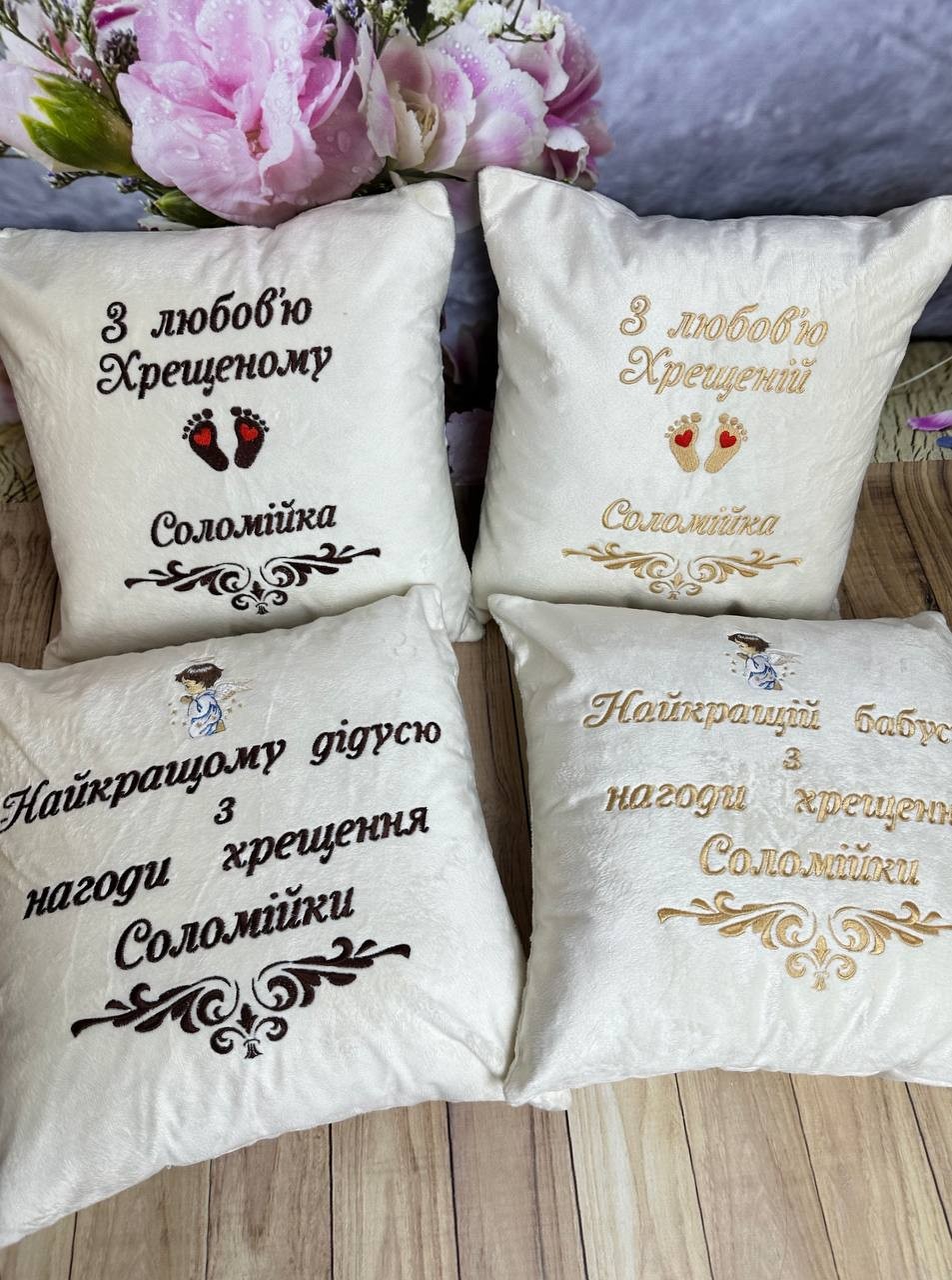 Мʼякесенька і така красива подушка на подарунок хрещеному, хрещеній, дідусю та бабусі. Розмір 40*40 см Наволочка змінна, збоку застібається на змійку. Наповнювач-холофайбер Наволочка -мʼякесенький плюш-вельбо.