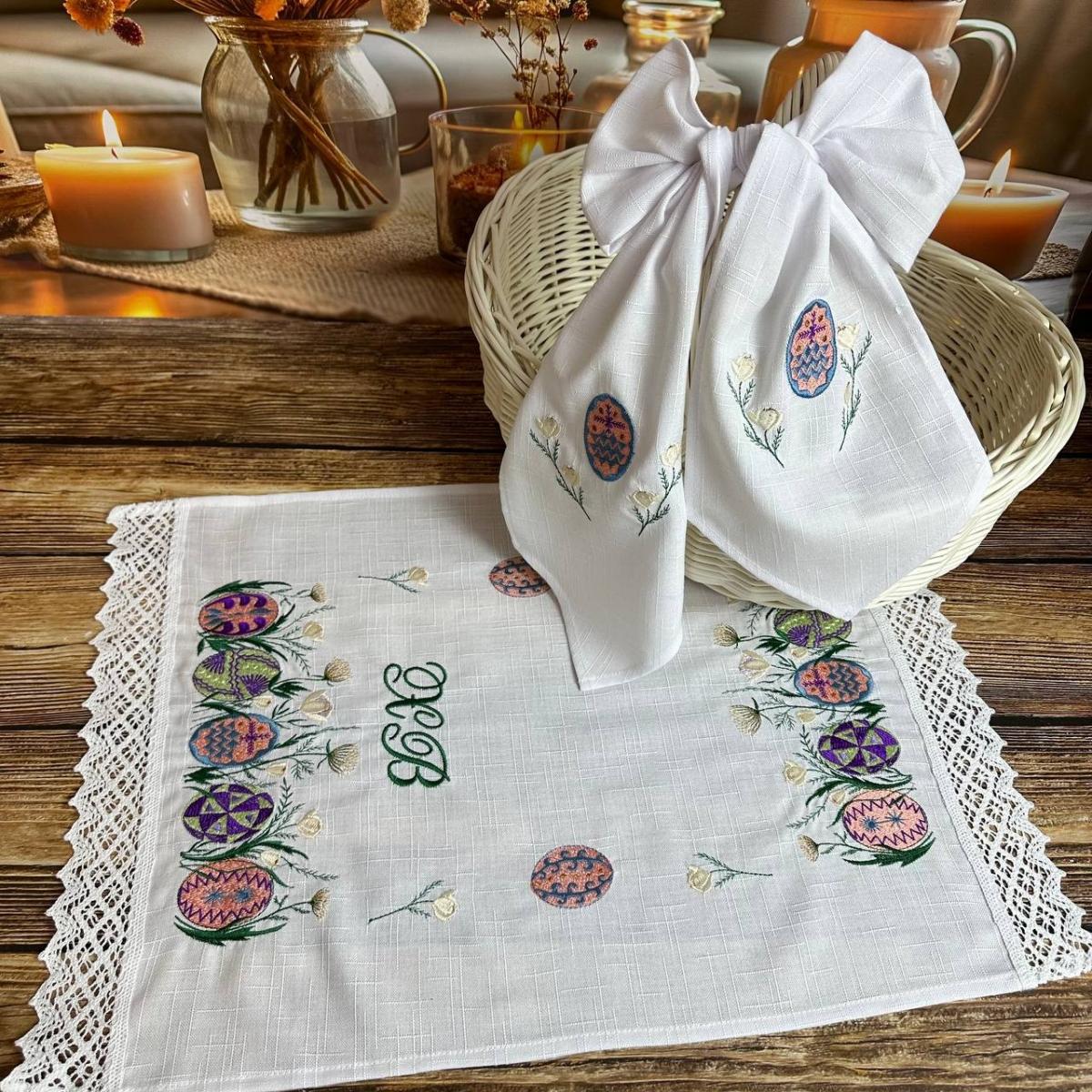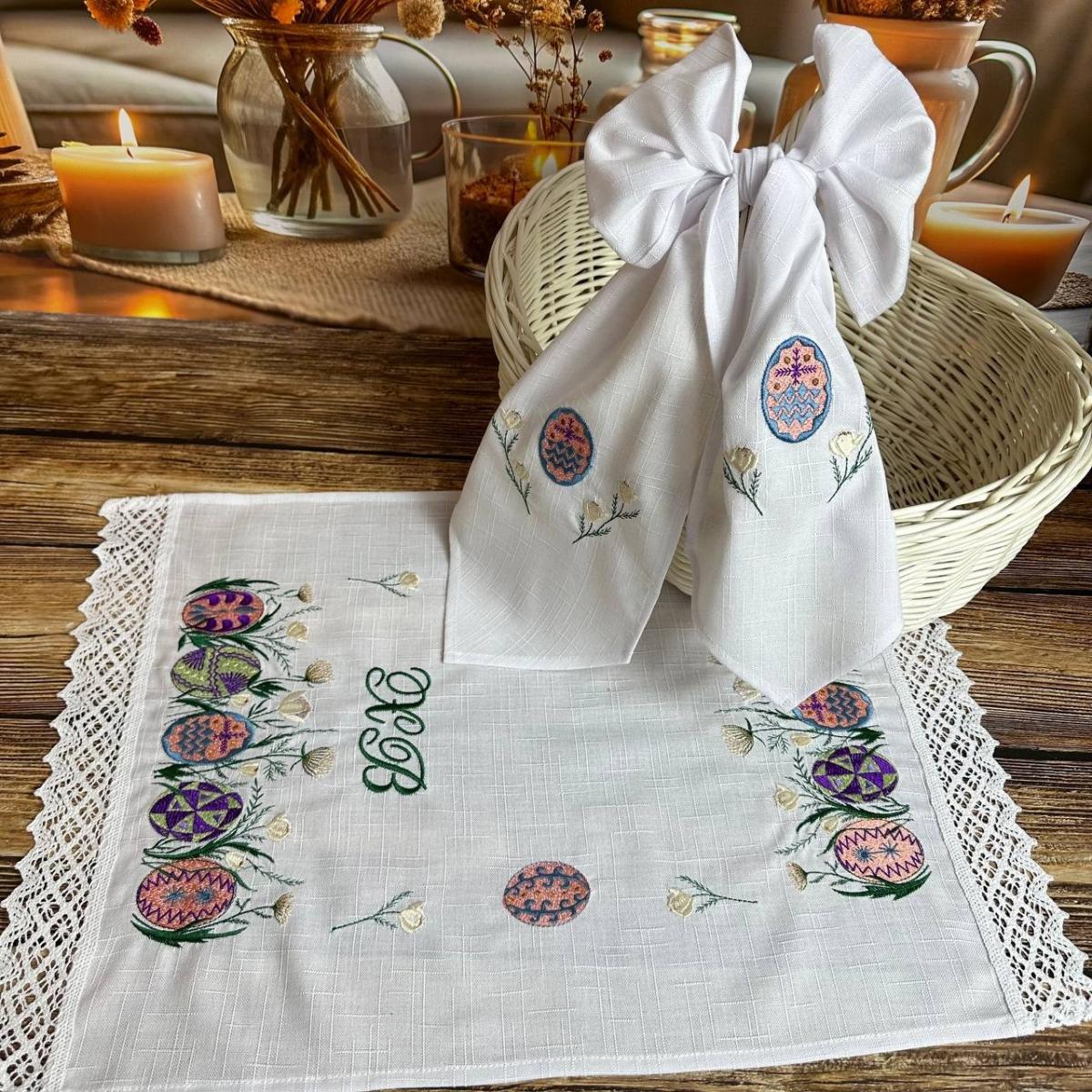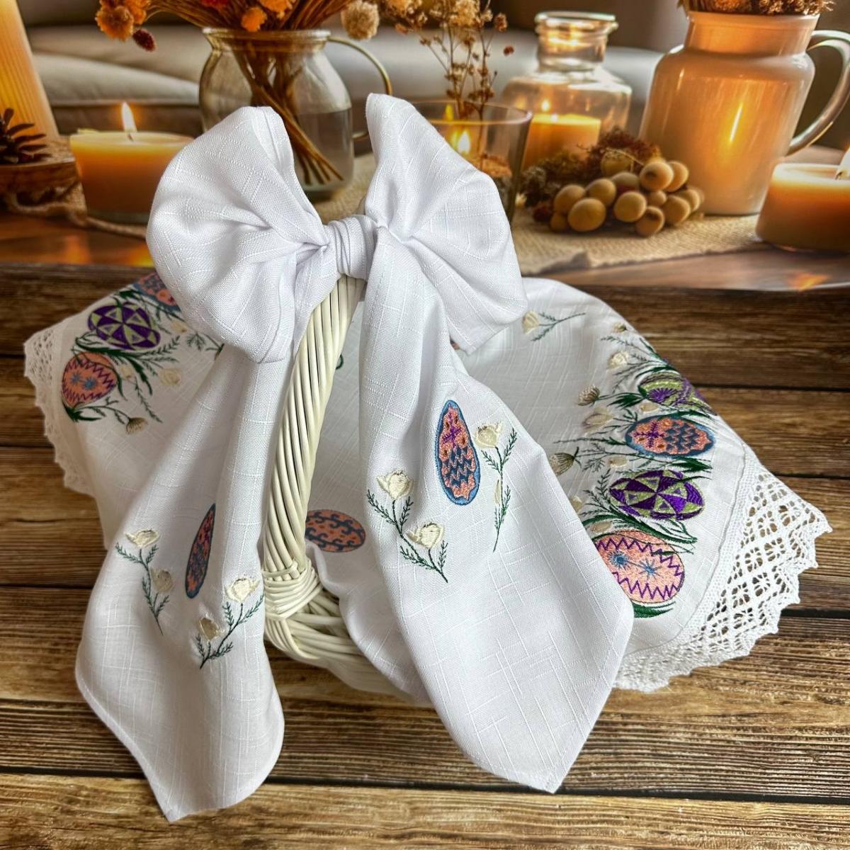 Ніжно вишитий рушник для кошика з великодніми писанками та весняними квітами. Виконаний у весняних кольорах, оздоблений бавовняним мереживом.