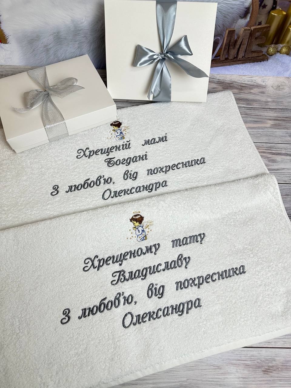 У нас ви можете замовити замовити чудові подарунки, до вашого свята. Хрещеним подарувати красиві і якісні рушники з індивідуальною вишивкою, прикрасити стіл, або пригостити кожного гостя смачною шоколадкою на згадку про цей чудовий день.