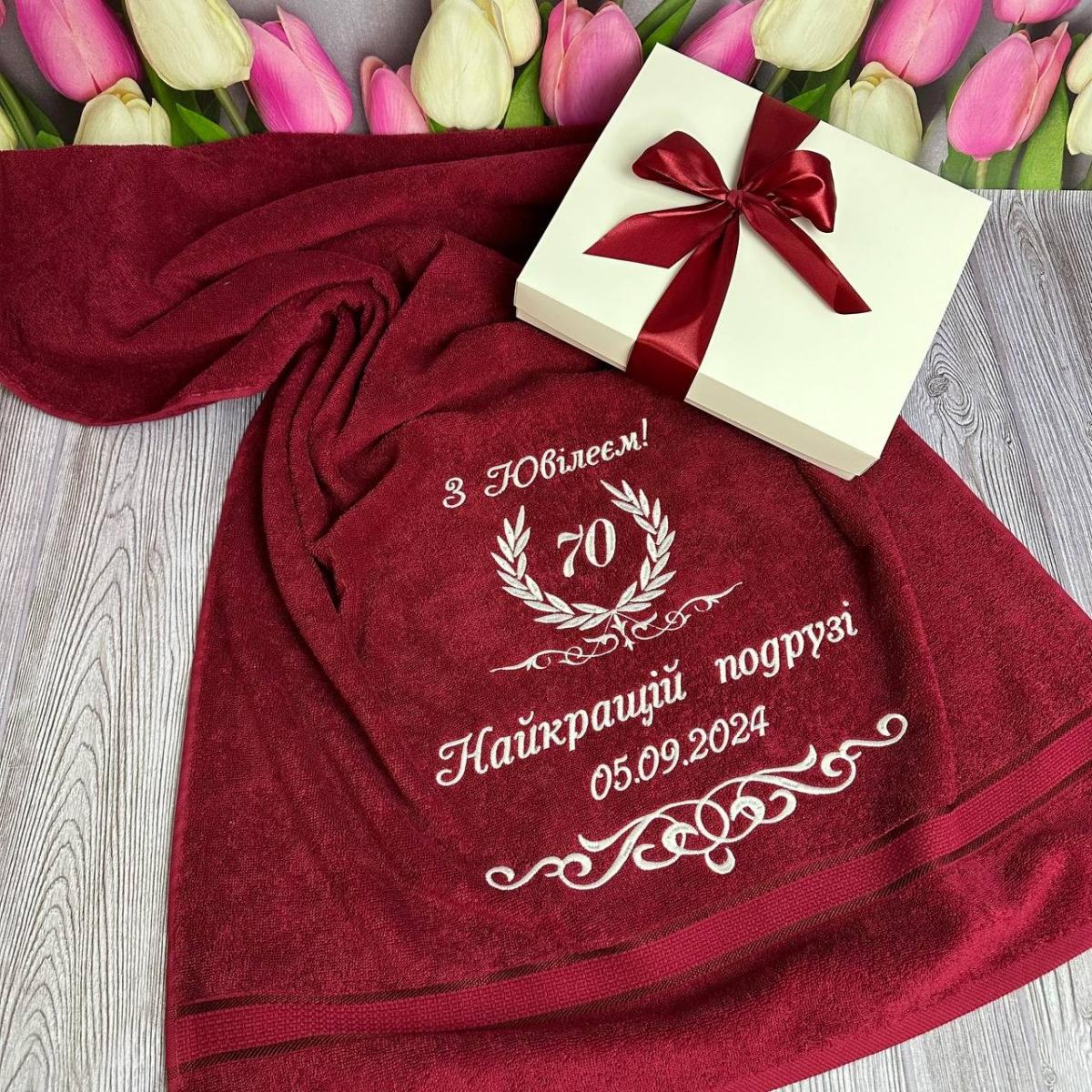 Рушник для подруги "З ювілеєм, 70!", розмір 50*90 см, щільність 500 г/м2