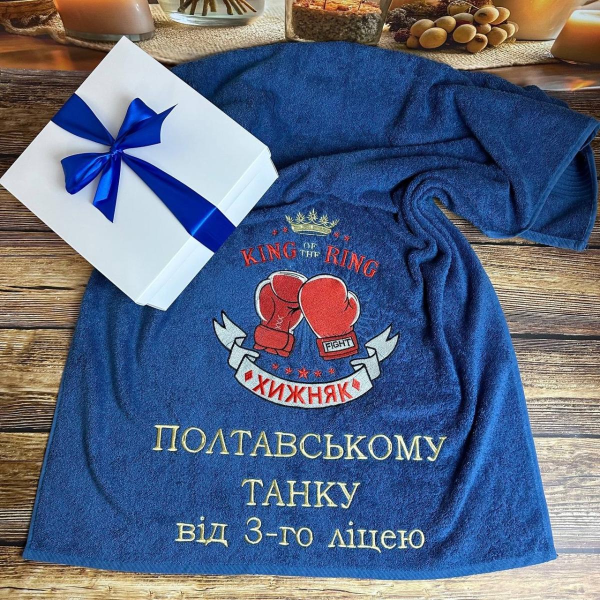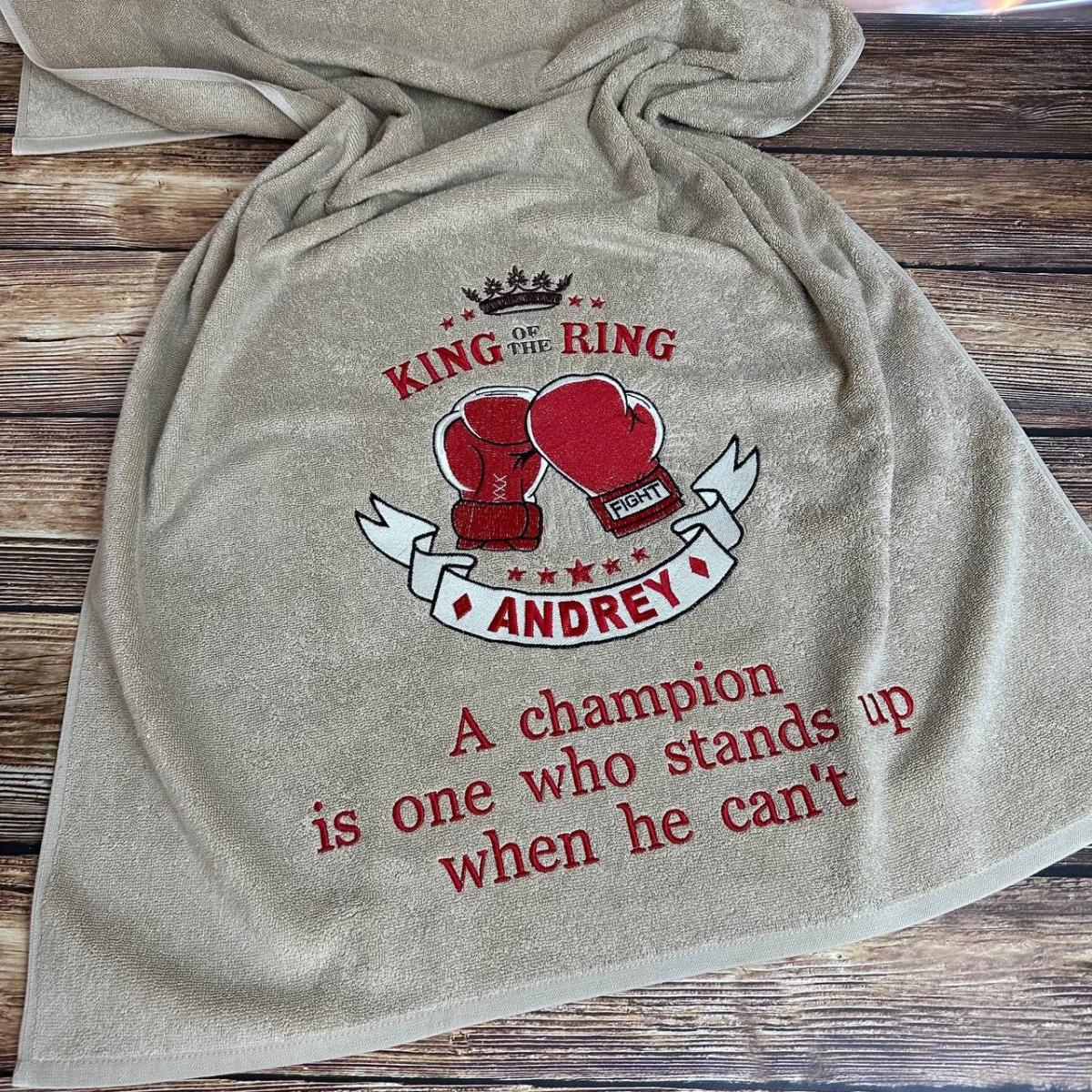 Рушник "Королю рингу" - стильний та енергійний аксесуар з витонченою вишивкою, що символізує перемогу та святковий настрій. Яскраві кольори та вишуканий дизайн роблять його ідеальним подарунком для справжнього чемпіона.