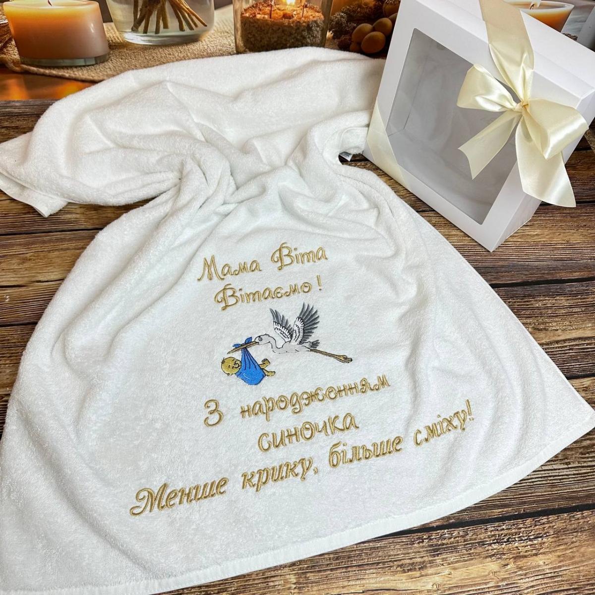 Рушник "Мамо, вітаємо з народженням синочка", розмір 70*140 см, щільність 450 г/м2