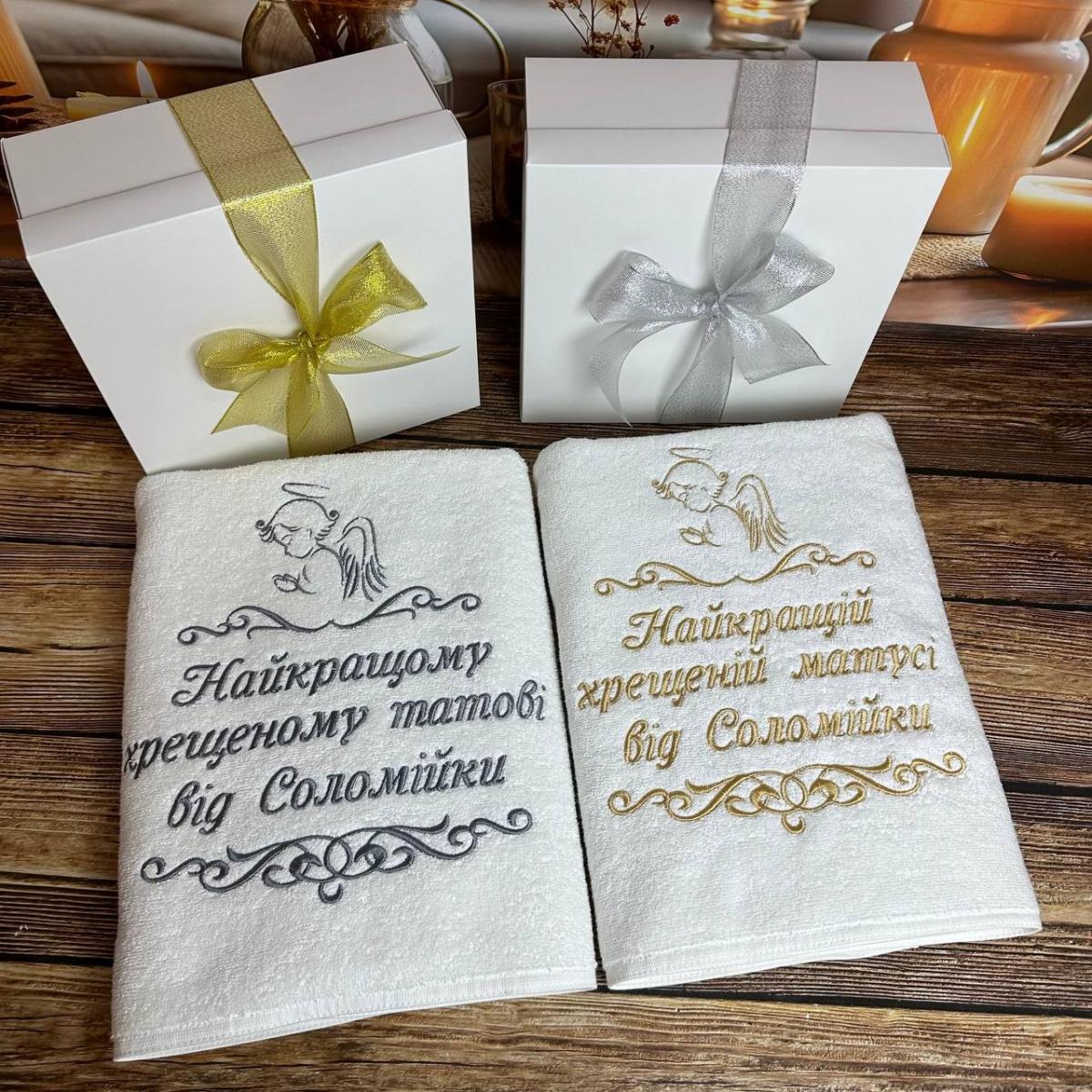 Рушник "Найкращим хрещеним татові і матусі від Соломійки", розмір 70*140 см, щільність 400 г/м2