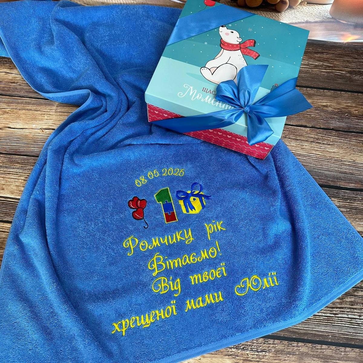 Рушник "Ромчику 1 рік. Вітаємо! Від хрещеної Юлії", розмір 50*90 см, щільність 450 г/м2