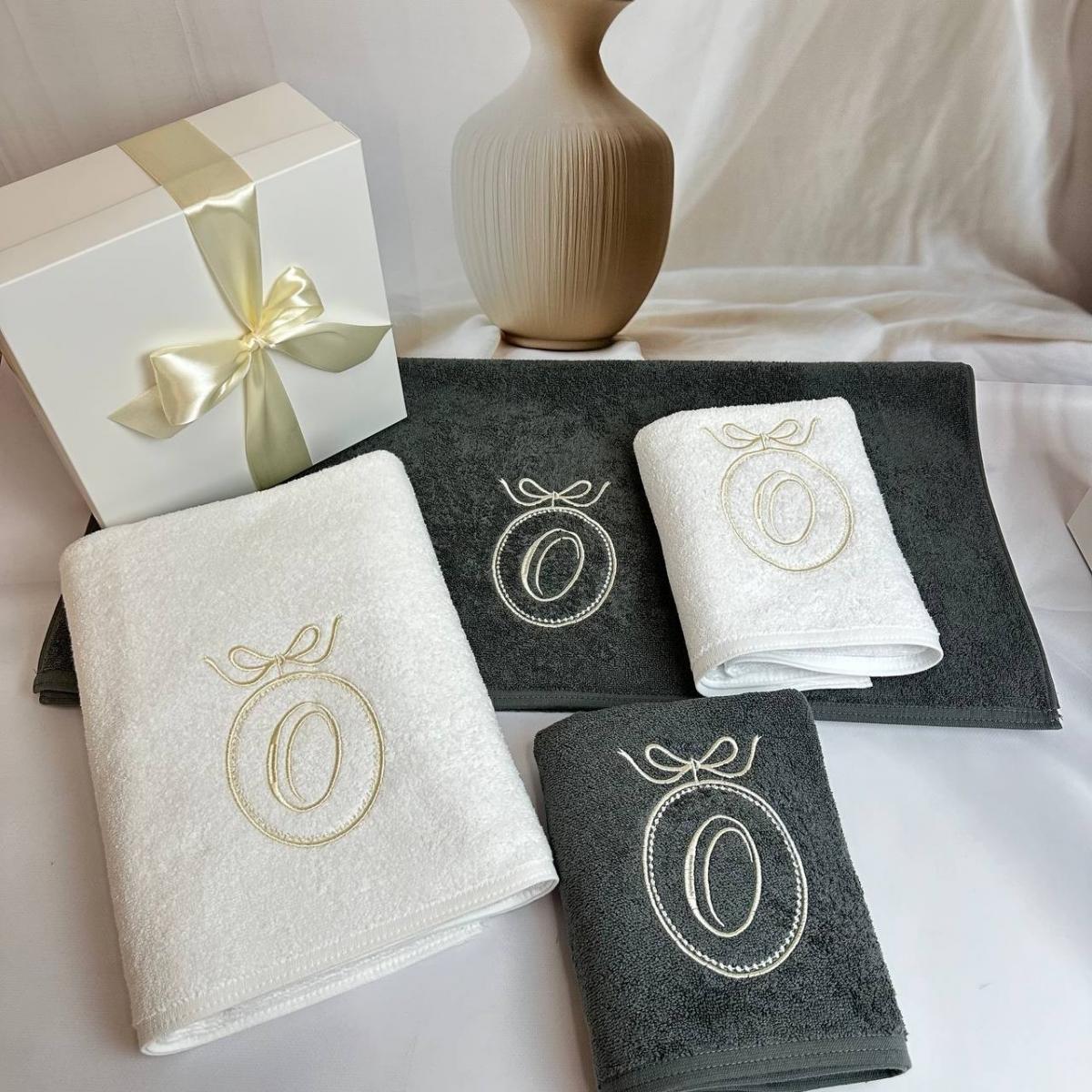 Набір рушників з монограмою "О" - елегантний комплект із м'якої бавовни, що включає рушники білого та сірого кольорів. Кожен рушник прикрашений вишитою літерою "О" з декоративним бантом. Ідеально для подарунка чи стильного доповнення до ванної кімнати.
